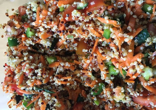 - Mix chopped green capsicum, red capsicum, spring onion, cherry tomatoes, grated carrot, zucchini, parsley, garlic cloves, cooked Quinoa. Add half tsp Himalayan salt. Adjust to your taste. Add 1 tsp of freshly squeezed lemon juice. Mix it gently with a fork. Serve it warm or cold. The Salad stays fresh in fridge in closed container for 2 days..